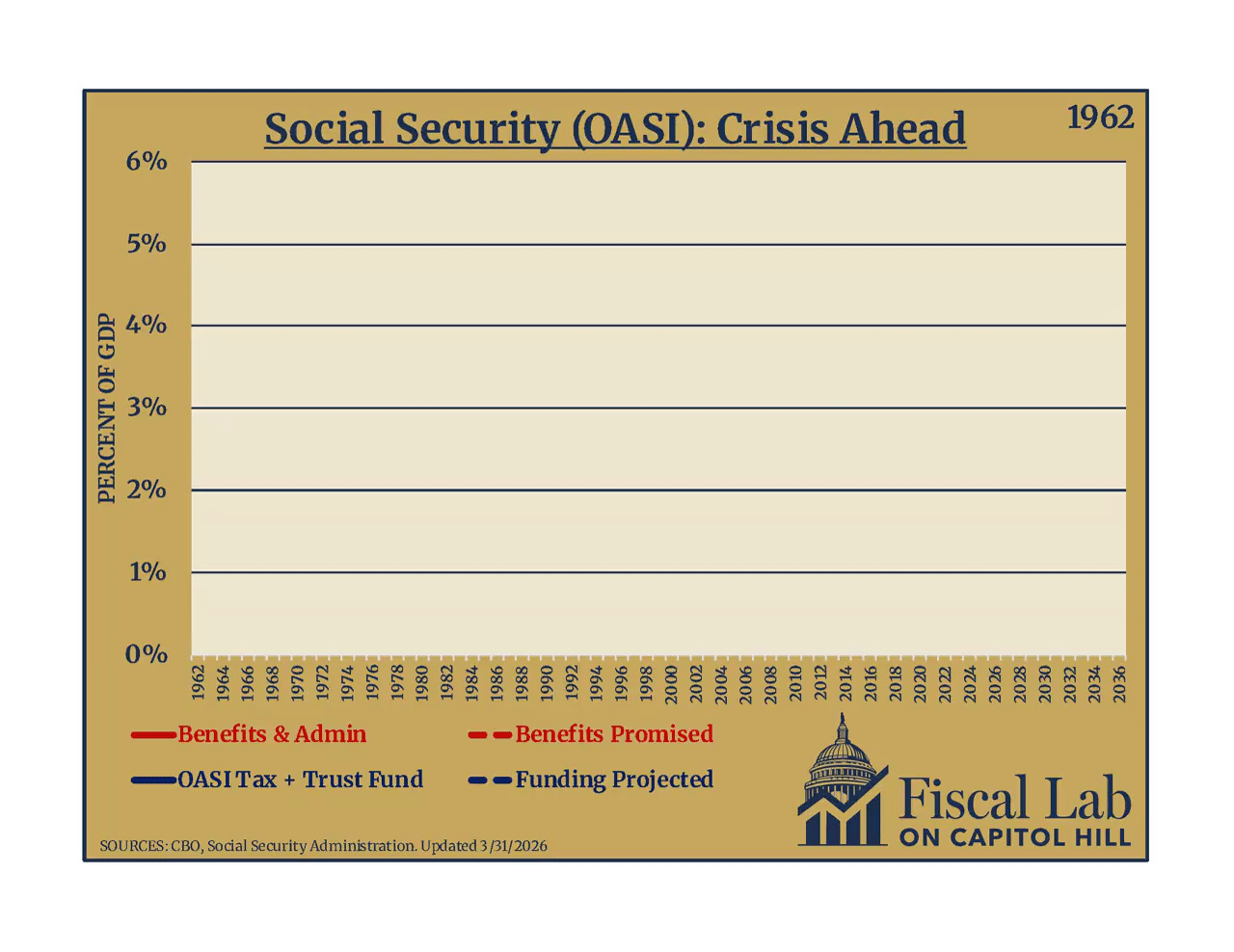 For years the program has relied upon its trust fund balances to cover the shortfall between benefits promised and Old Age Survivors Insurance (OASI) taxes collected, and that trust fund is projected to be fully exhausted by 2032. By law, a benefit cut must take place when tax revenue and trust fund reserves are insufficient to pay benefits. Beginning in 2032, that is a roughly $500 billion hole, or a 28-percent benefit cut, which worsens over time.