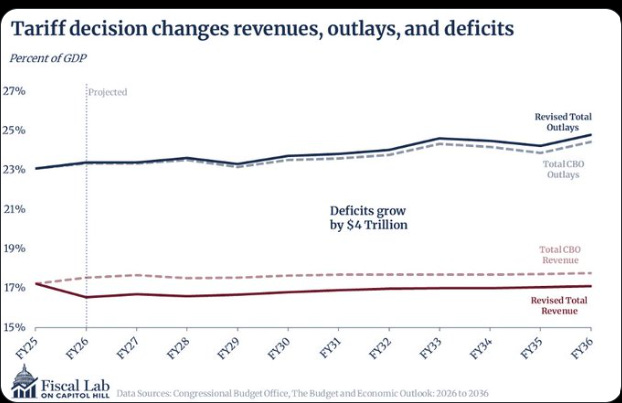 Yesterday, the Supreme Court ruled the IEEPA tariffs unconstitutional. Because those tariffs comprised a large share of the Trump administration’s trade agenda, the decision would change key policy assumptions underlying the CBO baseline. The Fiscal Lab has analysis of both the baseline and the budgetary implications of the court’s ruling.