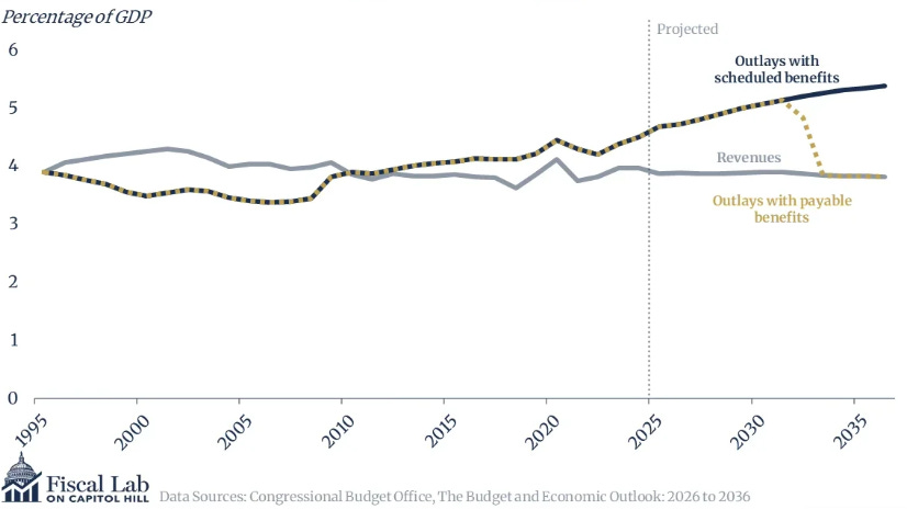 Figure 3: Revenues and Outlays for Social Security with Scheduled and Payable Benefits