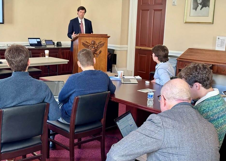 Fiscal Lab Senior Fellow Parker Sheppard instructs as seminar participants participate in a scoring exercise.